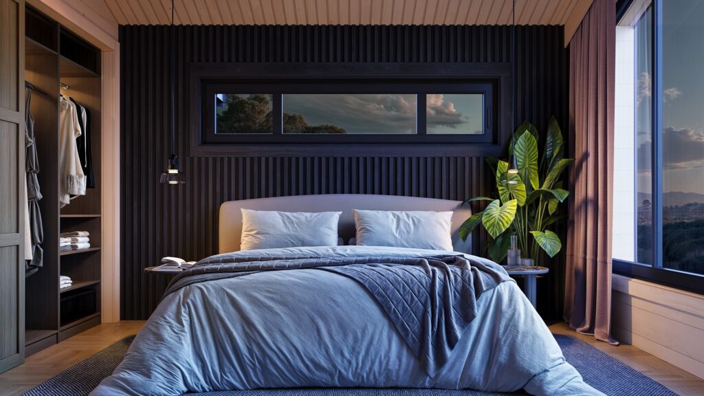 Lighting, colour palette, and material contrast working together to create a calm, intimate bedroom atmosphere that communicates comfort and emotional security.