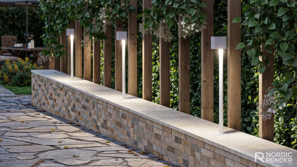 Outdoor lighting visualized in a residential garden setting, demonstrating how controlled illumination, materials, and surroundings work together to create a calm, inviting evening atmosphere.