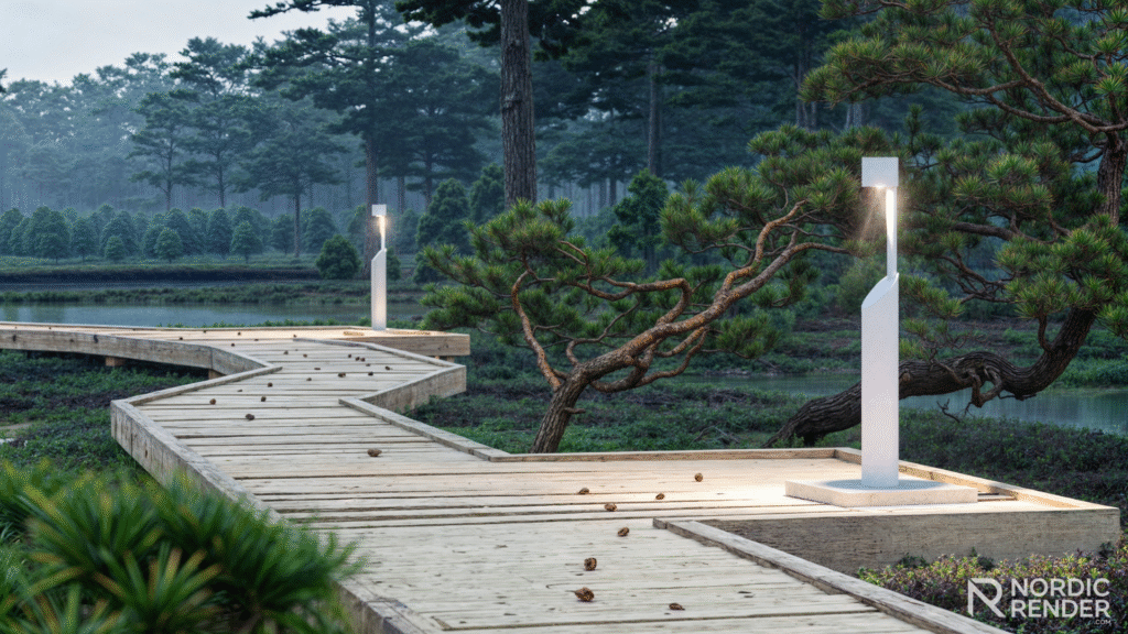 An outdoor lighting product visualized in a misty natural setting, demonstrating how light distribution and material finish interact with atmosphere to shape mood, depth, and spatial perception.