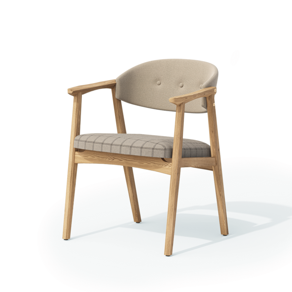 The chair visualized within a warm dining-room setting, showing how materiality, proportions, and design language integrate into a real interior and support a specific lifestyle.