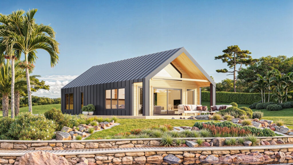 A compact wooden structure visualized within a lush Australian garden setting, showing how a simple building can become a warm, everyday living space connected to outdoor life.