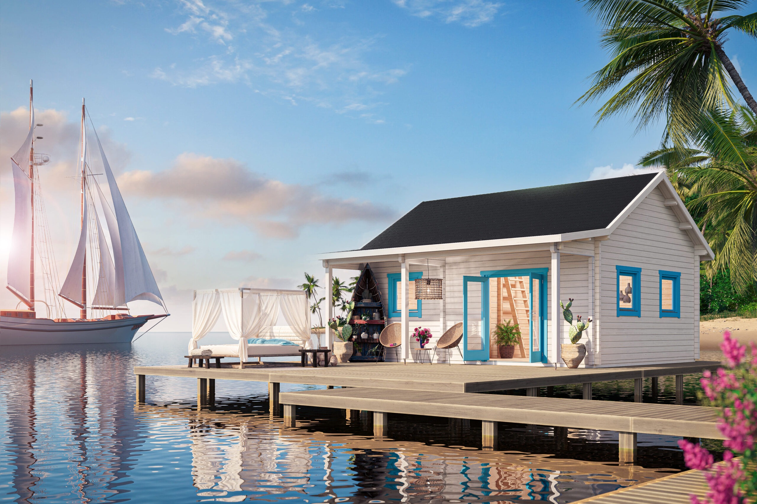 In the middle of the sea, a rocky island hosts a garden house surrounded by palm trees. A staircase leads down the rocky slope to the water’s edge, where a small boat awaits new adventures at the jetty.